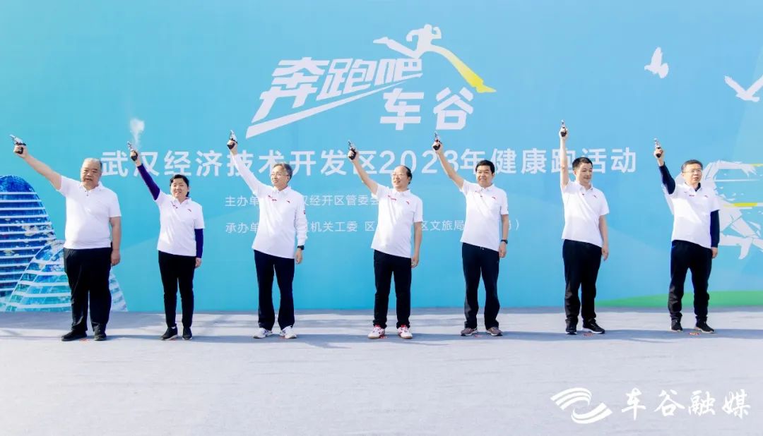 东风公司工会主席何伟,市委常委、武汉经开区工委书记刘子清,工委副书记、管委会主任唐超,武汉市体育局副局长颜璠,江汉大学副校长贾永胜,区人大常委会主任陈明骏,区政协主席徐安共同为健康跑活动鸣枪。