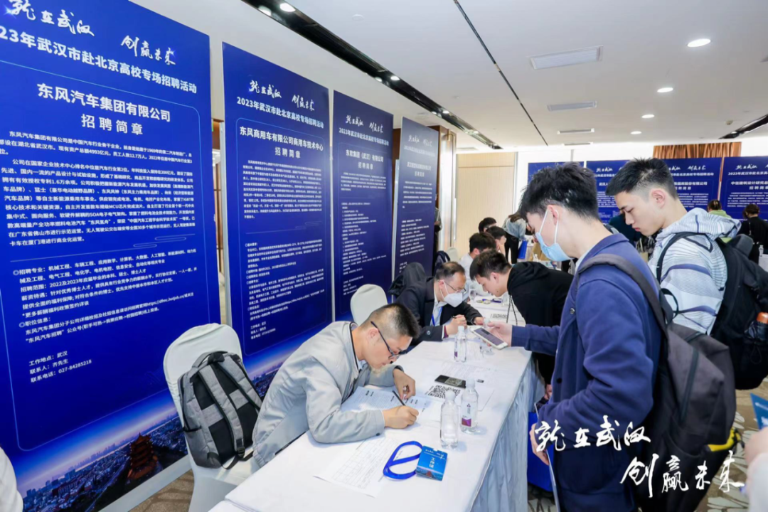 车谷融媒4月10日讯 4月9日,“就在武汉,创赢未来”2023年武汉市赴北京高校专场招聘活动开启。东风汽车集团股份有限公司、东风商用车有限公司商用车技术中心、东软集团(武汉)有限公司、中建三局绿色产业投资有限公司、江汉大学、武汉商学院等武汉经开区企事业单位组团共赴京城,开启求贤之旅。