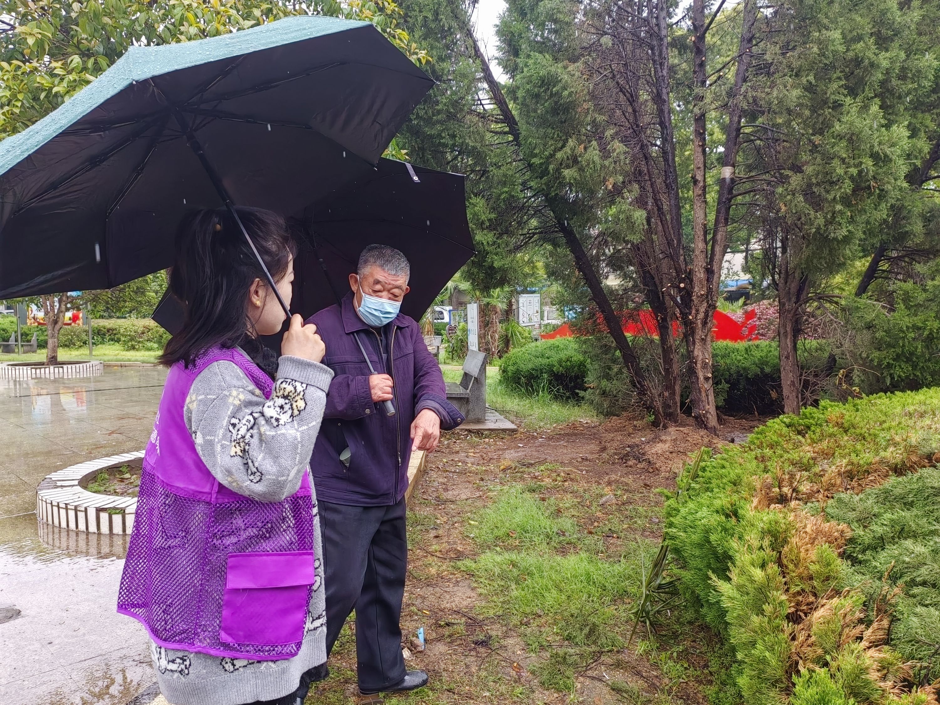 暴雨天气,社区老党员主动加入社区巡查队伍中排查安全隐患。在接到居民反映有树木倾倒问题后,他们第一时间赶往现场,发现在新民小区大广场内有一棵树被吹倒在地,他们就主动召集身边群众,合力把大树重新挖坑种植起来,并对落叶进行清理,避免影响居民出行。