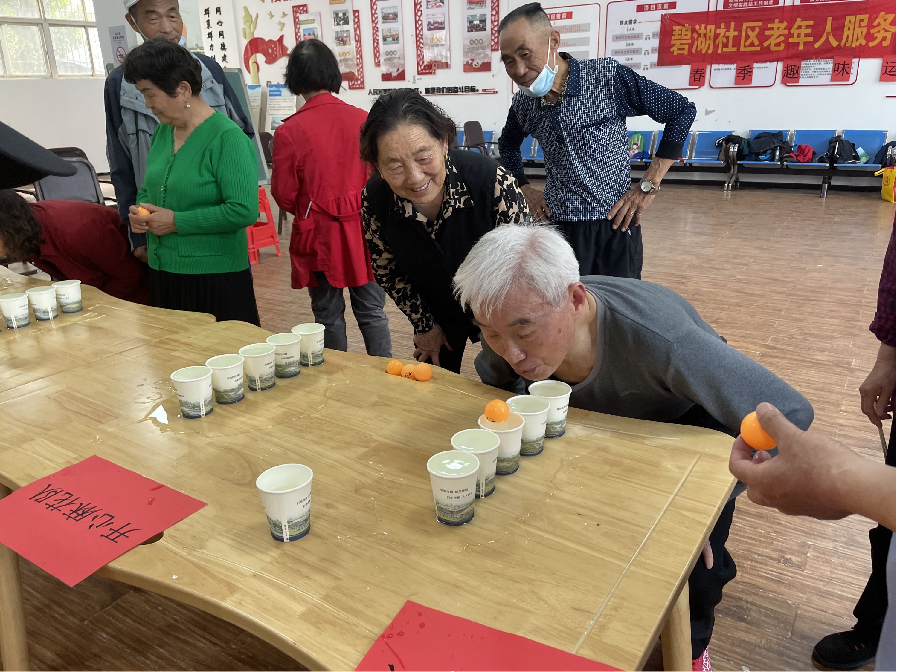 在团队趣味赛中,参赛老年居民自行3人组成一对,选好团队名称,进行团体赛。随着哨声令下,乒乓球接力赛比赛正式开始,有的参赛老人稳中求快,以迅雷不及掩耳之势将乒乓球夹给队员,有的则过于着急,导致乒乓球夹不起或掉在地上,令人惋惜。团体叠杯子比赛考验的是团队速度,开心麻花队首先完成。