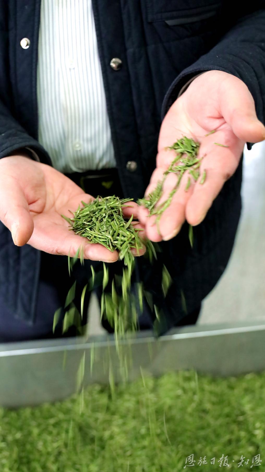 用工有保障,品质更要提升。在黄金洞乡金洞司村,恩施玉露制作技艺代表性传承人何光友正在杀青机前精准调控温度、频率和振幅。“近年来,我们以咸丰‘白叶一号’为原料,沿用恩施玉露的蒸青工艺。”何光友介绍,这样制作出的“恩施玉露”汤色更鲜绿明亮、口感更鲜爽甘醇。