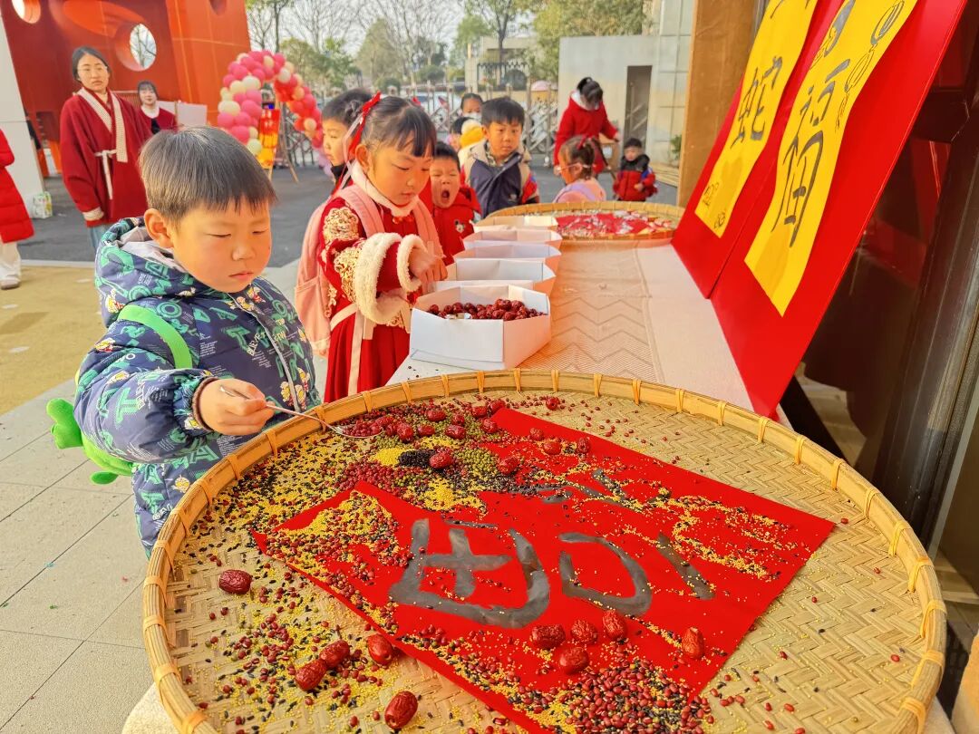 ▲车谷智慧幼儿园萌娃们用小手舀起寓意着“福气”的米粒,放入充满福气的大簸箕中,寓意着新的一年五谷丰登、福气满满!