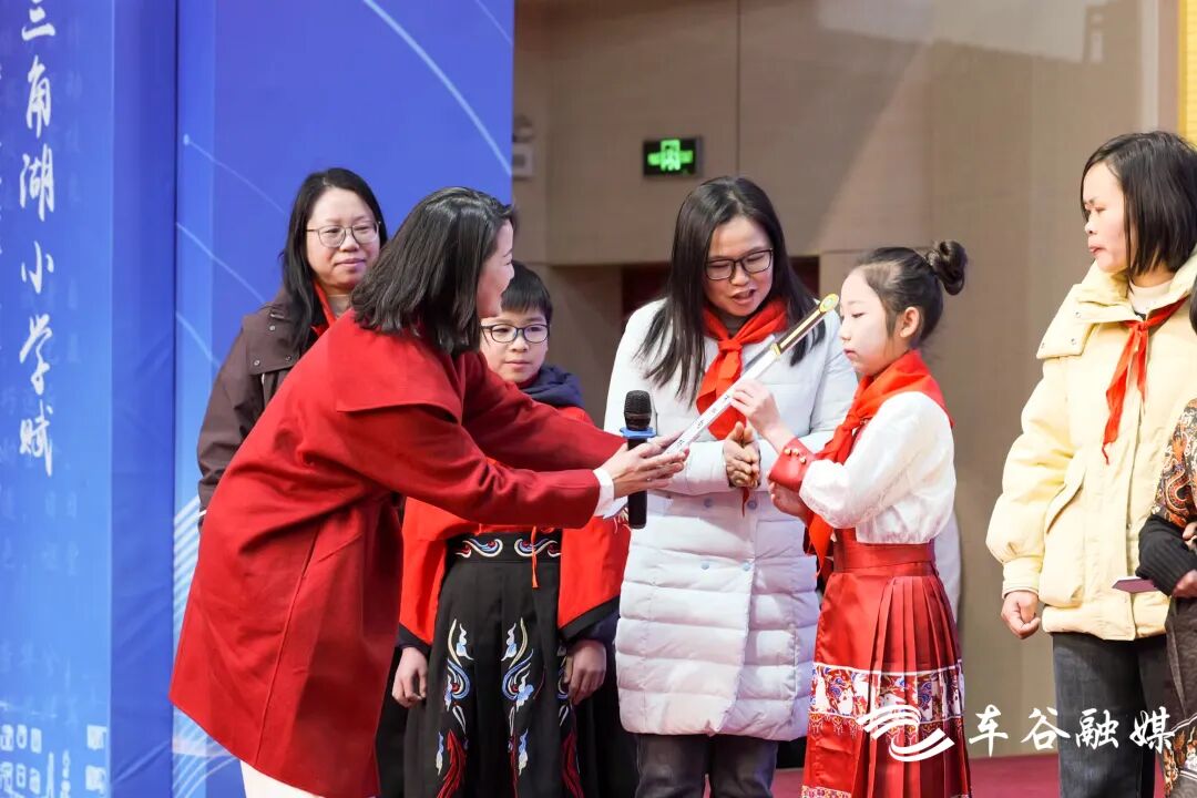 借助春节档热门电影中哪吒“我命由我不由天”的形象,校门口设置的哪吒主题打卡区受到学生热捧。三角湖小学二年级(2)班的张儒文抽取新年心愿卡后,开心地与“哪吒”“敖丙”“太乙真人”合照,蹦蹦跳跳走进校园。开学典礼上,各年级收到了学校赠送的“起航剑”“积发剑”“奔程剑”“如愿剑”“星风剑”“朝阳剑”等“法宝”,为同学们送上祝福。