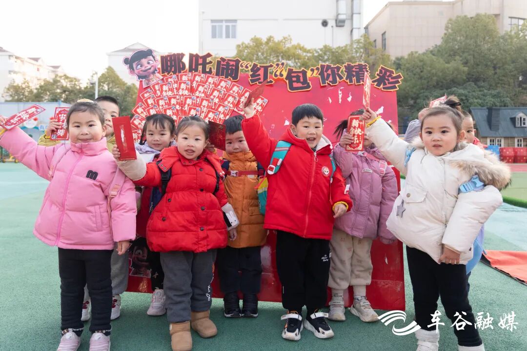 今年寒假,电影《哪吒2》火遍大街小巷。薛峰幼儿园开学日,“哪吒”元素满满。该校教师扎起同款“哪吒头”,换上喜庆的红装,精心准备哪吒主题的红包、贴纸和合影墙,让孩子们在开学第一天收获惊喜与欢乐。