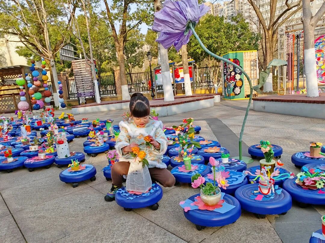 ▲育才实验幼儿园孩子们带来亲手制作的盆栽,将校园装扮成彩色花海。