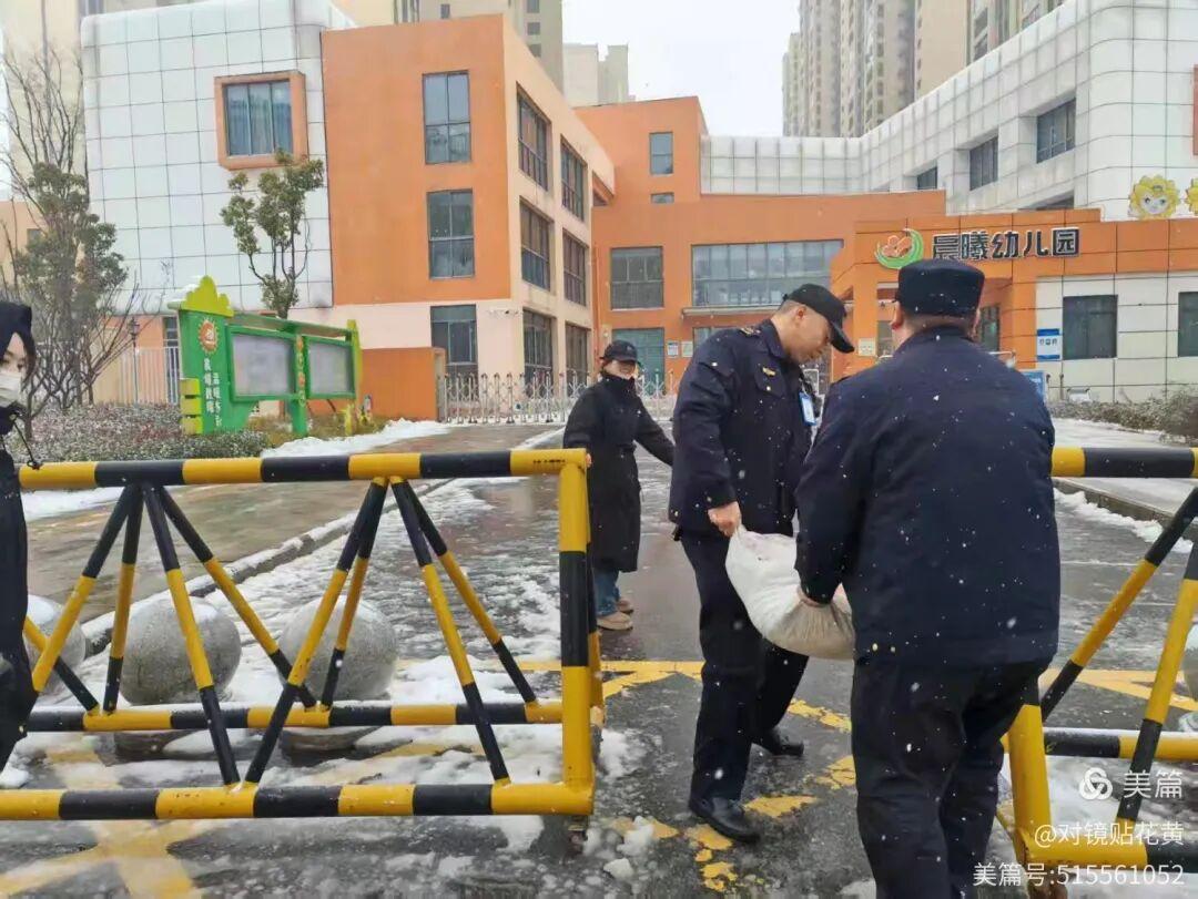 与此同时,武汉经开区纱帽街道综合执法中心的艾博接到紧急通知,“晨曦幼儿园需要融雪剂,请即刻出发!”他二话不说召集队员们,扛起融雪剂、铁锹和防滑垫,驱车前往,赶在孩子们上学前清理出了道路。