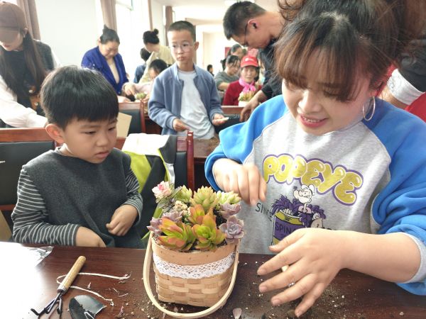 活动中,孩子们在家长的指导下,小心翼翼地挑选多肉幼苗,认真地填土、放苗、压实,再搭配铺面石装饰,每一个步骤都做得一丝不苟、有条不紊。家长们放下忙碌,全身心投入,耐心引导孩子动手操作,时不时与孩子交流想法、配合协作,有的帮忙扶稳花盆,有的协助整理叶片,亲子间的默契在指尖流转,欢声笑语充盈着整个活动现场。